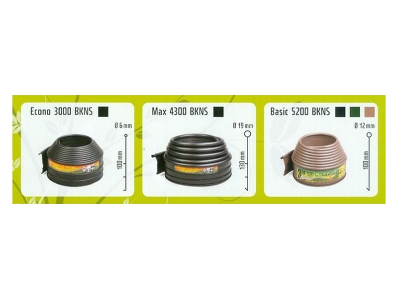 Jednoduché řešení pro oddělení záhonů od trávníku. Obrubník se jednoduše umístí zároveň s terénem, takže lze sekat trávník až do kraje. ECONO 3000 BKNS – délka role 6 m, výška 10 cm, šířka horní hrany 6 mm, barva černá