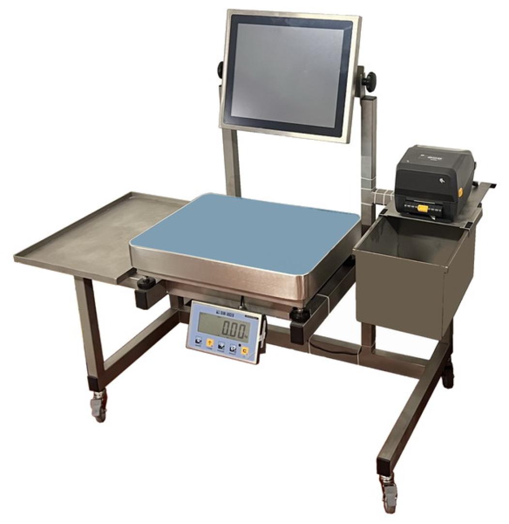 Sestavu tvoří nerezový stojan s odkládací plochou pro přepravku, nerezovou váhu o rozměru 450x600mm, PC nerezový terminál POSINOX 19 s 19" dotykovou obrazovkou, police pro tiskárnu s krytem, který zároveň slouží jako sběrací krabice podkladového papíru při tisku etiket. Stojan je opatřen pojezdovými kolečky s aretací