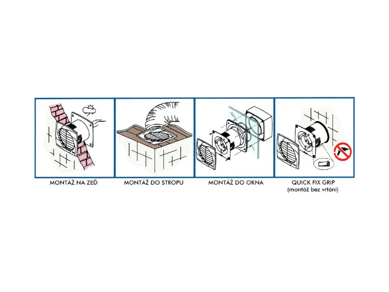 Bílý axiální ventilátor s nízkou mřížkou, zpětnou klapkou, snadná montáž do zdi nebo stropu bez nutnosti vrtání, snadná údržba, pro každý interiér