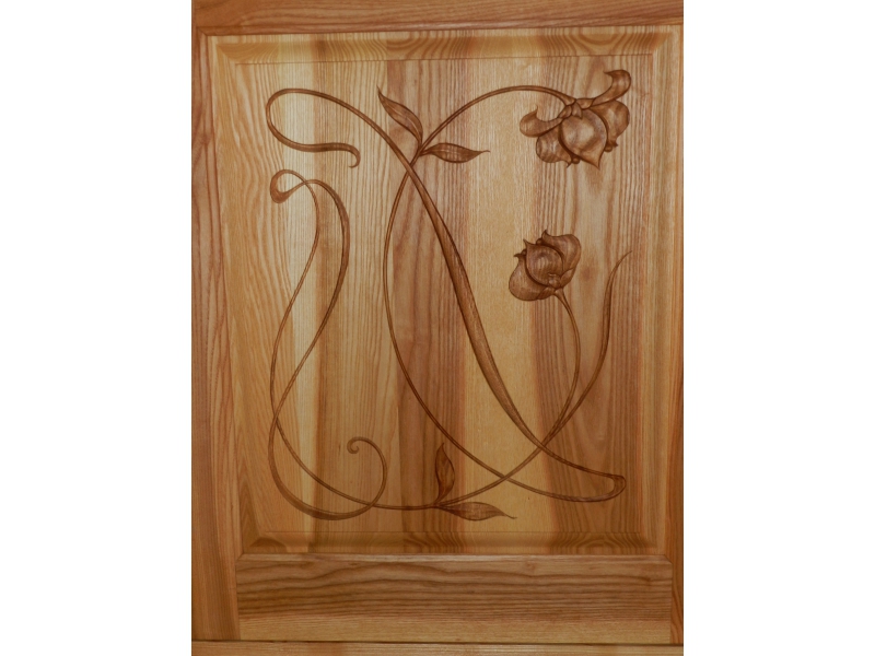 Jasanová knihovna zdobená ručně vyřezávanými reliéfy ve výplních a volutami zakončujícími kanelované hrany.