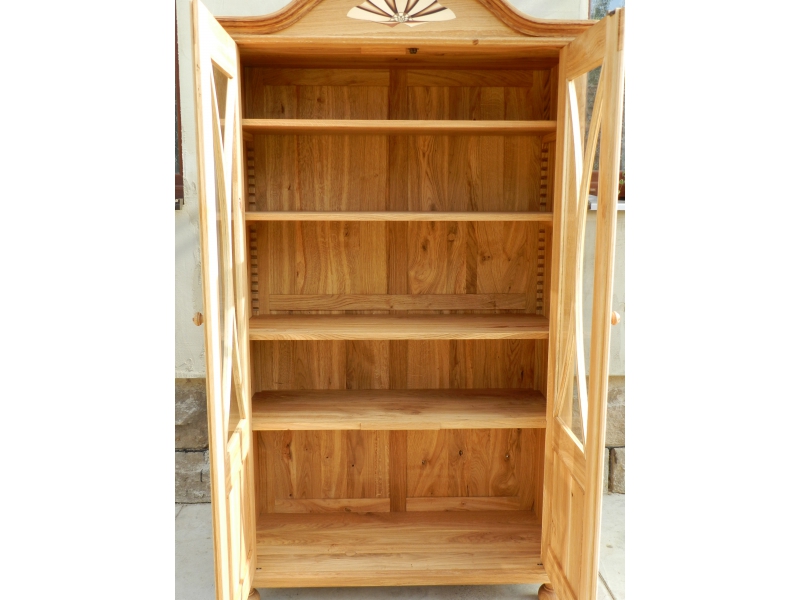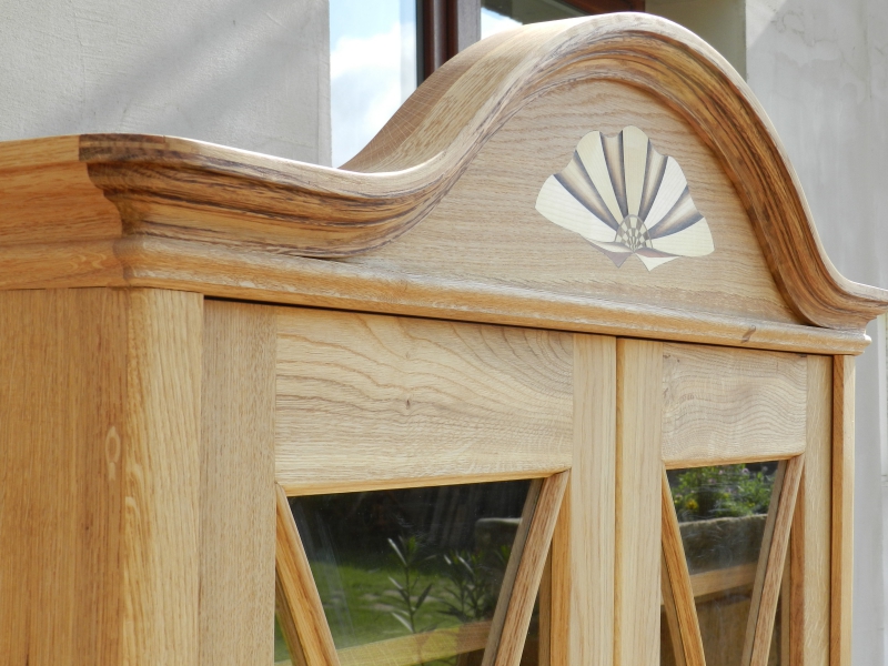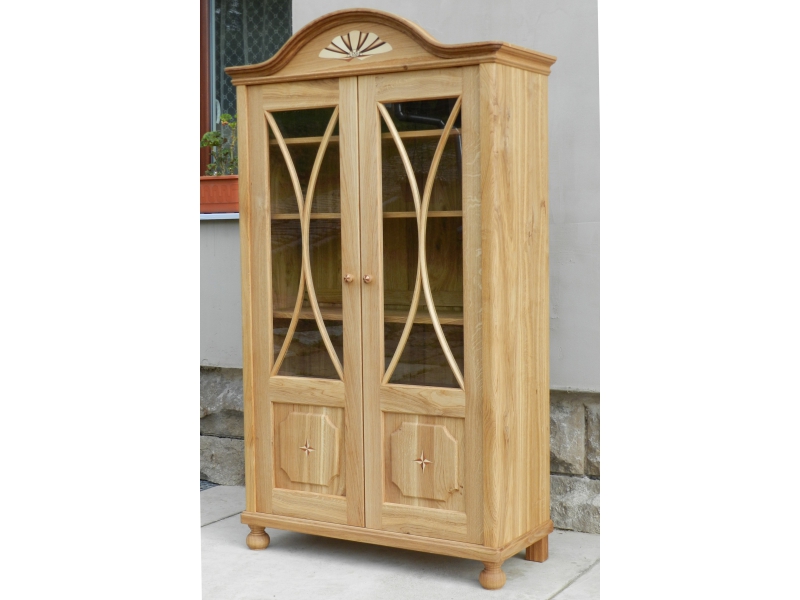 Knihovna je vyrobena z dubového dřeva dekorována drobnou intarzií a ohýbanými prvky. Uvnitř snadno polohovatelné police. Povrchová úprava je provedena přírodním kvalitním olejem. Knihovna je součástí souboru nábytku obývacího pokoje.