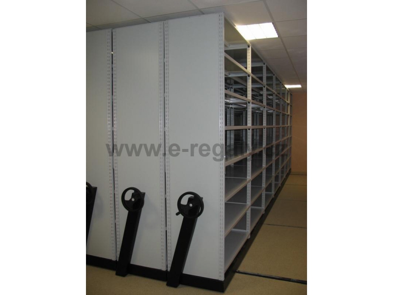 Regály na podvozcích jezdí po ocelových drahách umístěných na podlaze. Regály se elektricky posouvají tak, aby vznikla potřebná ulička.