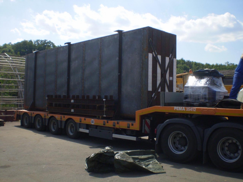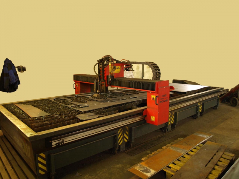 Dělení materiálu provádíme na nůžkách největší o šířce 4m nebo na dvou CNC plasmách kde můžeme pálit plech až do velikosti 2x6m a do síly 30mm plasmou nebo 100mm acetylenem.