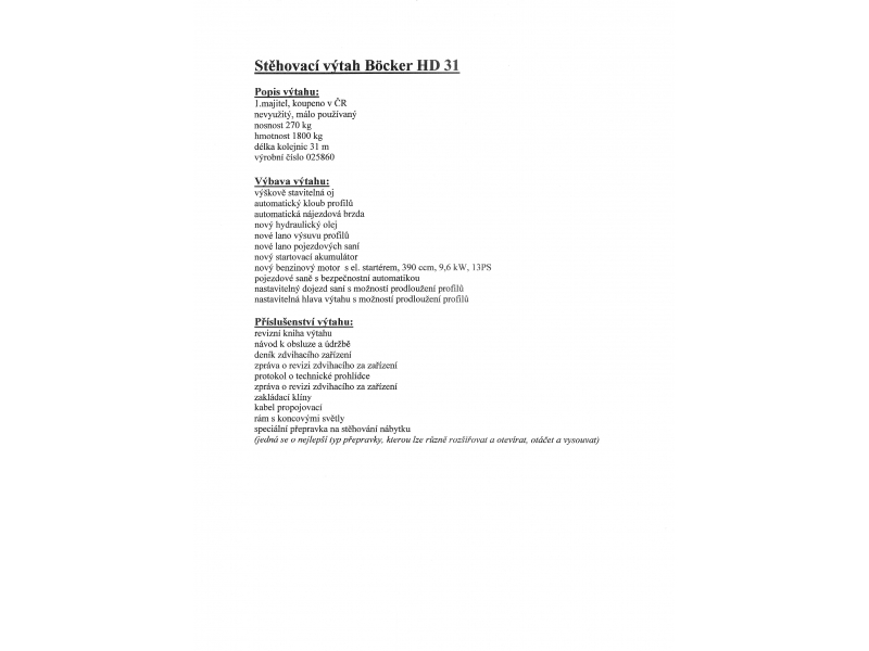 Stěhovací výtahy Böcker jsou pro svůj vysoký výkon a rychlost převážně využívány stěhovacími firmami. Díky speciální stěhovací plošině je možné dopravovat téměř veškerý nábytek a usnadnit stěhování. Výtah pohání motor HONDA s el. starterem.
