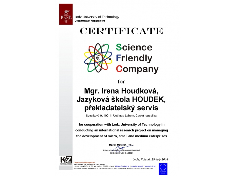 Jazyková škola Houdek, překladatelský servis nabízí rychlé a kvalitní překlady z/do řady světových jazyků. Zajišťuje též soudně ověřené překlady (s kulatým razítkem). Přeloží Vám obecné i odborné texty, technické návody, reklamní materiál, webové stránky aj.. Pořádá jazykové kurzy pro každého (firmy, maturanty, cizince, širokou veřejnost), dále přípravné kurzy pro mezinárodní zkoušky (FCE, ZD). Najdete nás také v Teplicích - ulice Lipová 81. Těšíme se na Vás.