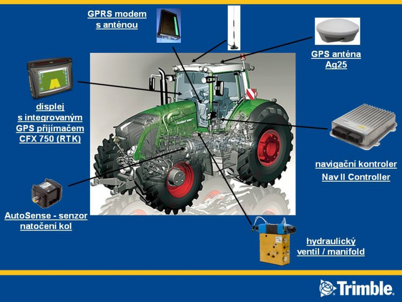 Trimble AgGPS Autopilot je systém, který se nainstaluje na hydrauliku řízení zemědělského stroje a s použitím GPS dat řídí stroj automaticky po požadované dráze tvaru přímky, křivky, pivotu nebo jejich kombinací. Přesnost navádění +/- 3 cm.