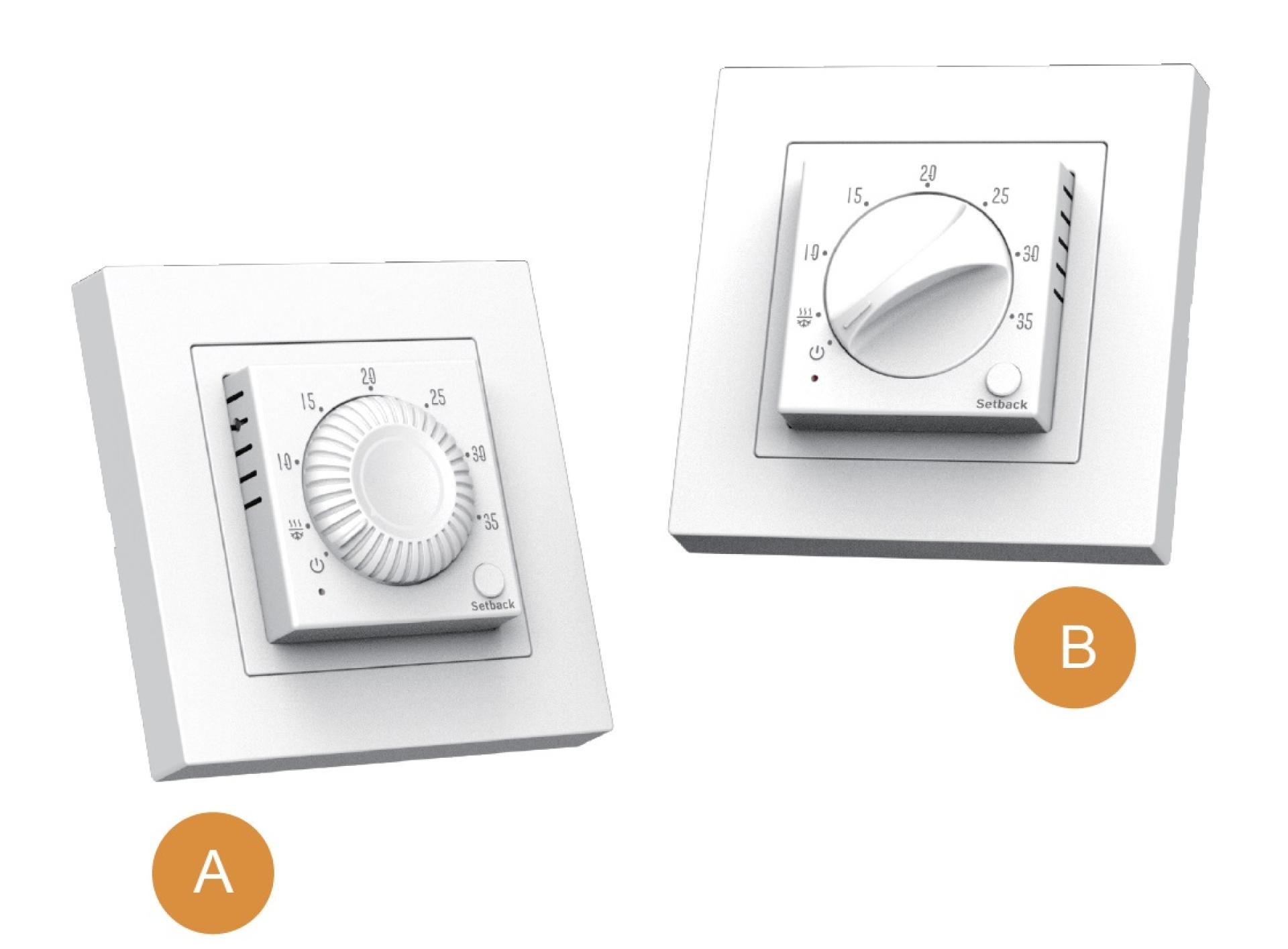 Termostat EKOHEAT REG ET-28 je mechanický, ručně ovládaný termostat, který pro přesnou regulaci teploty využívá prostorový i podlahový teplotní senzor. Můžete nakonfigurovat různé adaptéry pro výměnu středního rámu podle potřeb zákazníka. Kromě toho jsou součástí balení standardně dva různé typy knoflíků, které mohou zákazníci libovolně měnit.