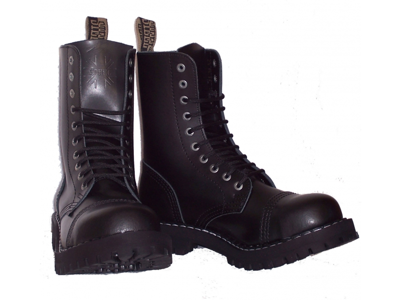Originální boty STEEL 10 dírek. Výška cca 23-25 cm. Podrážka je vyrobená z klasické tvrzené gumy s tzv. "traktor vzorem" ozdobená šrouby a plíškem s nápisem Steel. Špice je prošívaná vybavená ocelovou špicí.