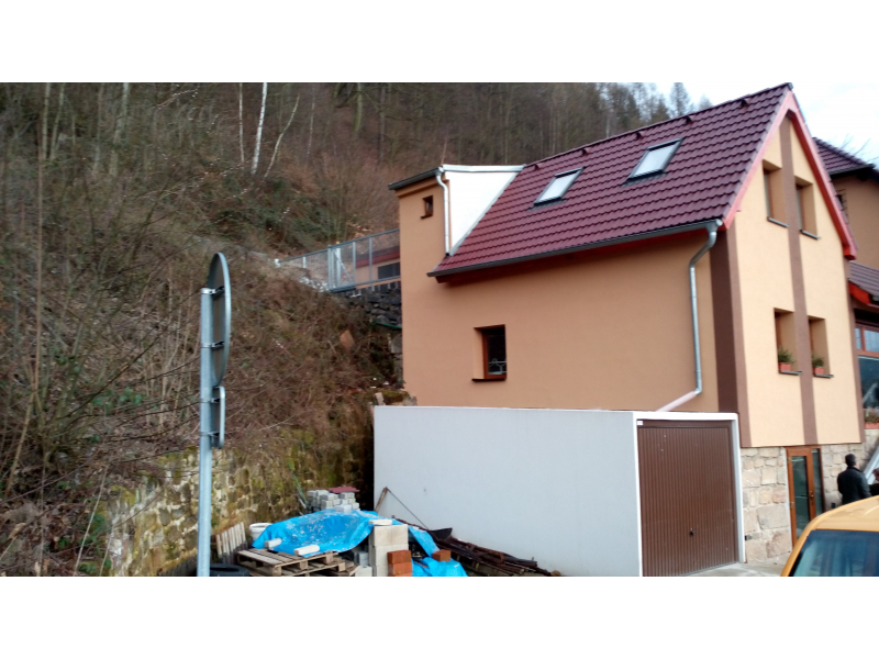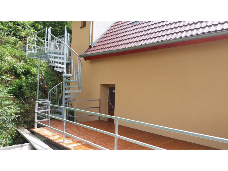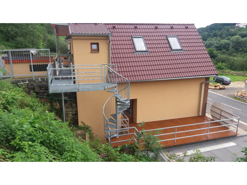 Výroba a montáž balkonu na stávající garáž s točitým schodištěm a vjezdovou bránou.