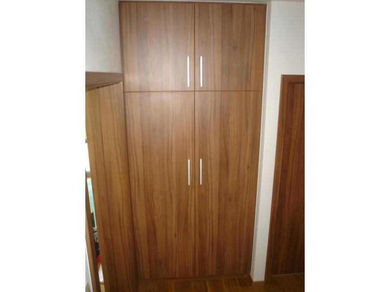 Vestavěné skříně a šatna na míru. Materiál ořech a bílá hladká. Prostor je co nejefektivně využit a navíc skříně zakrývají el. vedení a potrubí.