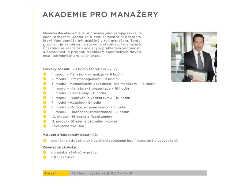 Manažerská akademie je připravena jako veřejný rekvalifikační program. Dvousemestrální program Vám pomůže být úspěšný v roli manažera. Program je zaměřen na rozvoj a stabilizaci manažerů. Účastníci získají vědomosti a dovednosti, projdou tréninkem.