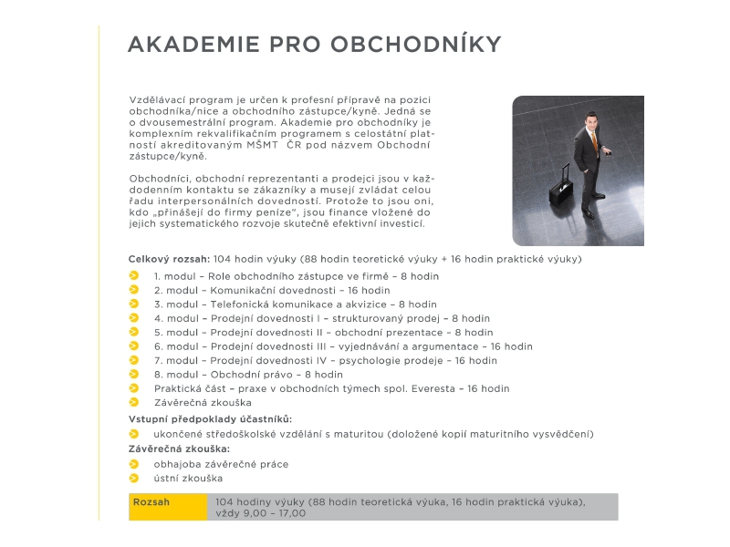 Dvousemestrální vzdělávací program je určen k profesní přípravě na pozici obchodníka/nice a obchodního zástupce/kyně. Je komplexním rekvalifikačním programem s celostátní platností akreditovaným MŠMT ČR.