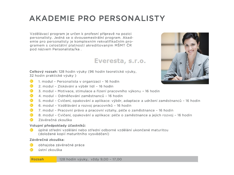 Dvousemestrální vzdělávací program je určen k profesní přípravě na pozici personalisty. Akademie pro personalisty je komplexním rekvalifikačním programem s celostátní platností akreditovaným MŠMT ČR.