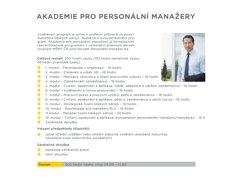 Vzdělávací program je určen k profesní přípravě na pozici manažera lidských zdrojů. Jedná se o dvousemestrální program. Akademie pro personální manažery je komplexním rekvalifikačním programem s celostátní platností akreditovaným MŠMT ČR.
