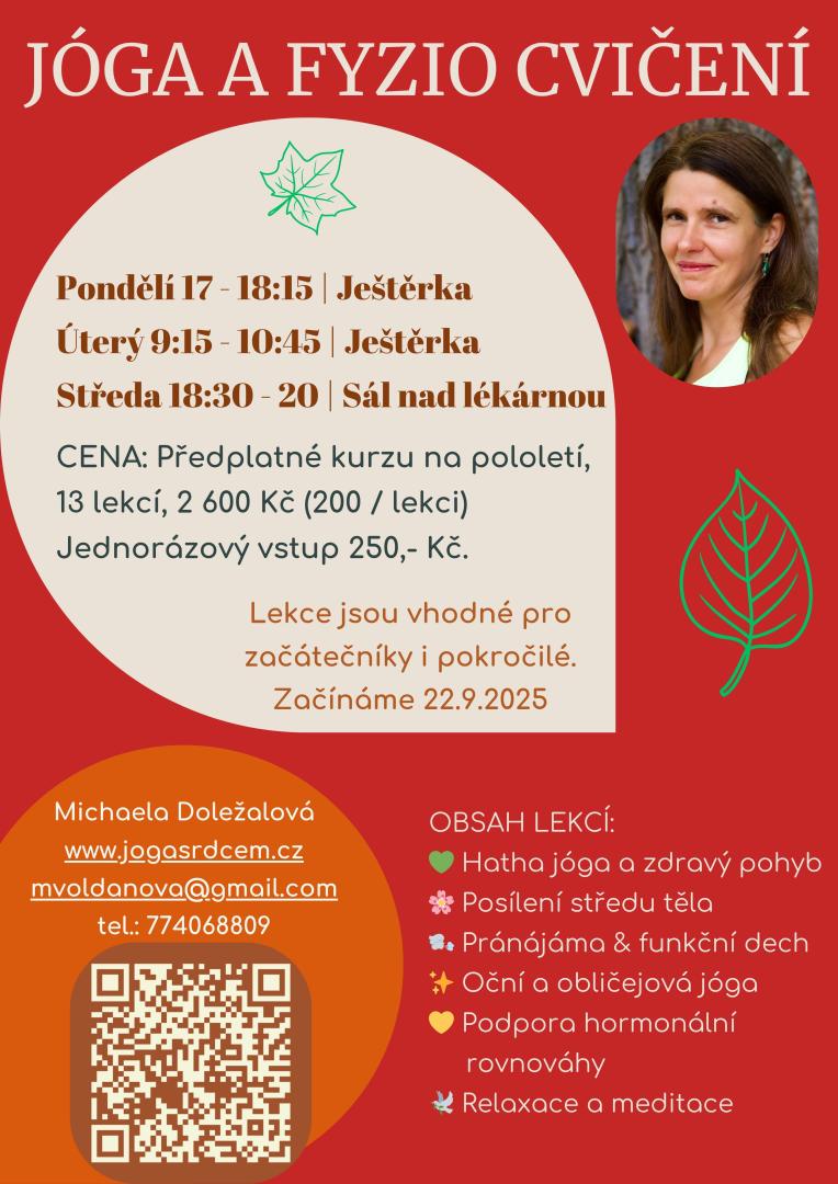 Ve svých lekcích spojuji jógu, meditace, dechová cvičení, mindfulness, fyzio cvičení a relaxace do harmonického celku, který přináší klid tělu i mysli. Vedu lekce zaměřené na zdravý pohyb a vědomé vnímání těla, ať už hledáte jemné uvolnění po náročném dni nebo hlubší restart energie.