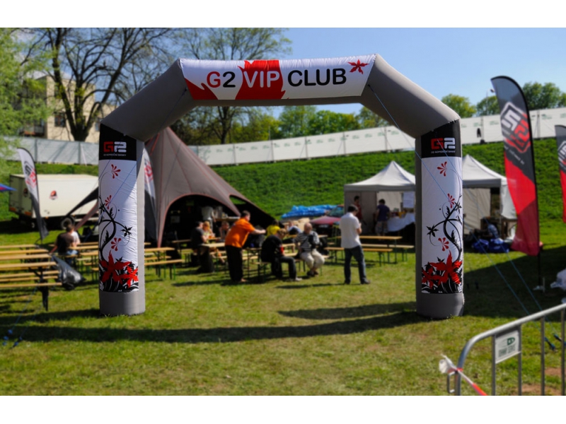 Nafukovací brána určená k umístění reklamy. vnitřní rozměr 4 x 3,5 m, noha 72 cm. Uchycení na suchý zip.