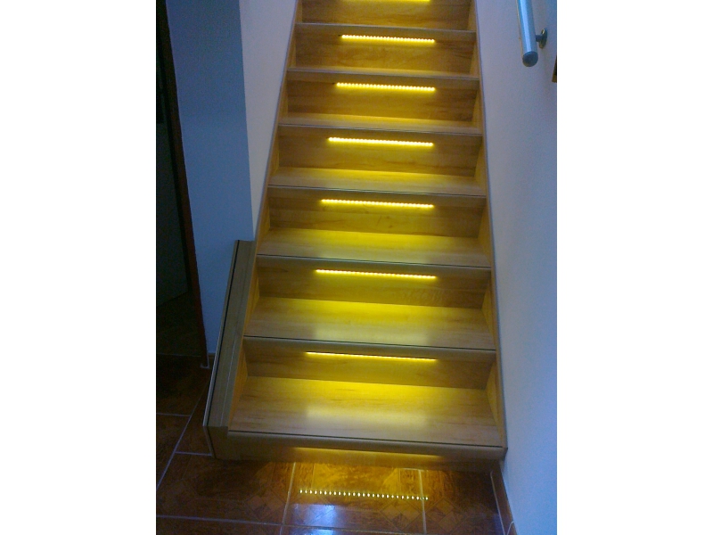 Kovové schody obložené lamino nášlapy, které můžou ve stejné barvě pokračovat v plovoucí podlaze.