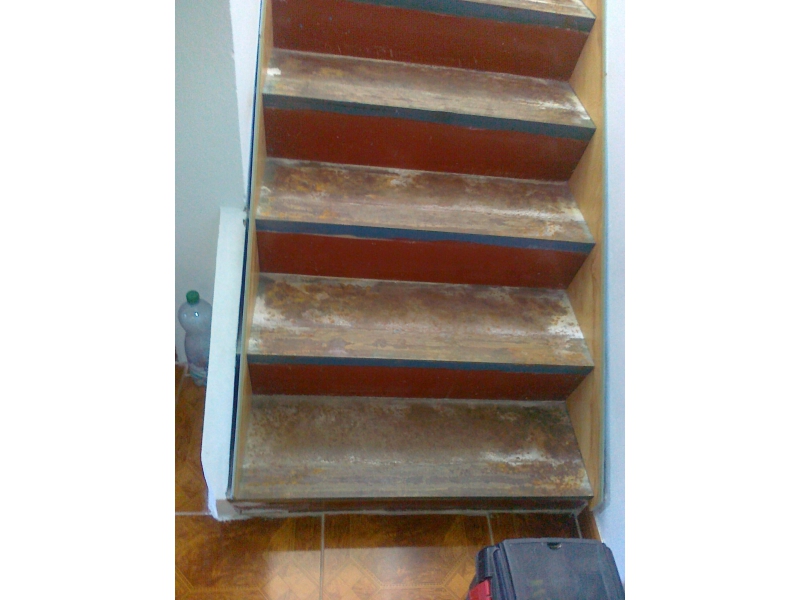 Kovové schody obložené lamino nášlapy, které můžou ve stejné barvě pokračovat v plovoucí podlaze.