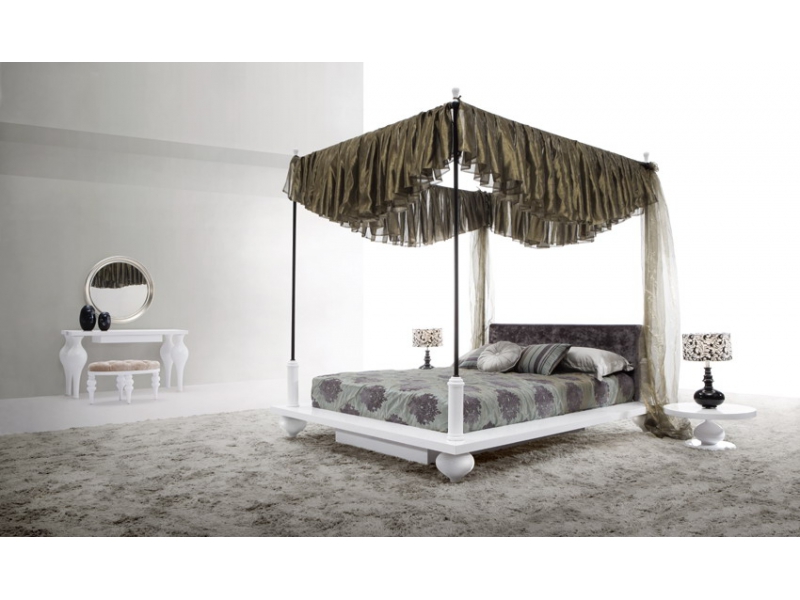 Postel bílý lesklý lak, tyčová konstrukce + baldachýn látka