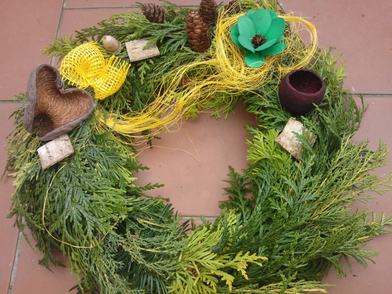 na objednávku uvážu ze živých větví velký věnec vhodný na pohřby, včetně stuhy s nápisem dle přání, květy mohou být umělé/textilní, nebo živé