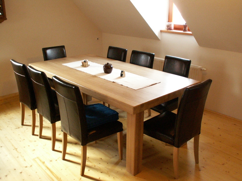 Navržen a vyroben do otervřené kuchyně podkrovního bytu. Stůl vytváří dominatu prostorného podkrový, kterou umocňuje použitý materiál, dub horský a rozměry masivní dubové desky a nohou stolu.Délka stolu 2220 mm, šířka 1110 mm, nohy 120x120 mm.