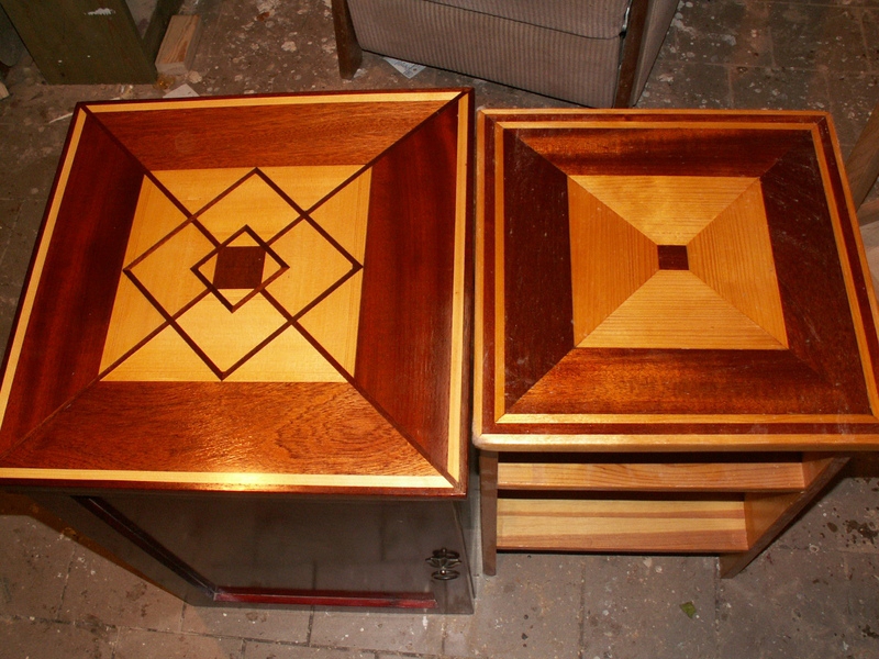 panský a dámský stolek,na vrchní desky použitá technika inkrustace a kombinace tmavého mahagonového a světlého smrkového dřeva.První stolek s otevíracími dvířky,poličkou a výsuvnou zásuvkou..Druhý stolek realizován v jenoduším provedení.