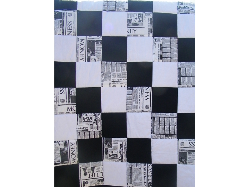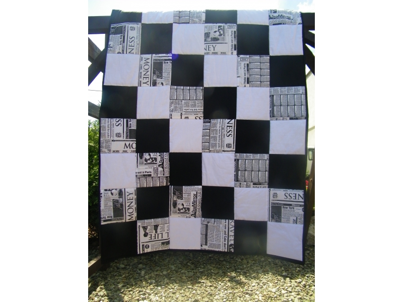 Deka (přehoz,v létě možno i peřina), černo-bílá kombinace, ušitá technikou patchwork, vyteplená vatelínem, celoprošitá 25x25, motiv večerních londýnských novin :-)