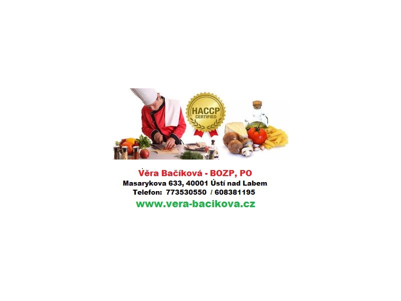 Nabízíme kompletní servis našich služeb v oblasti BOZP, PO, systém HACCP, verifikace teploměrů v HACCP, hygiena práce, atd. Vypracování dokumentací, školení, zastupování při kontrolách. Hasící přístroje, lékárničky, bezpečnostní značení a další produkty. Pracujeme kdekoliv po celé ČR