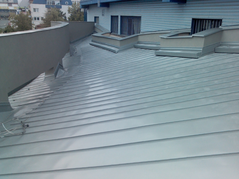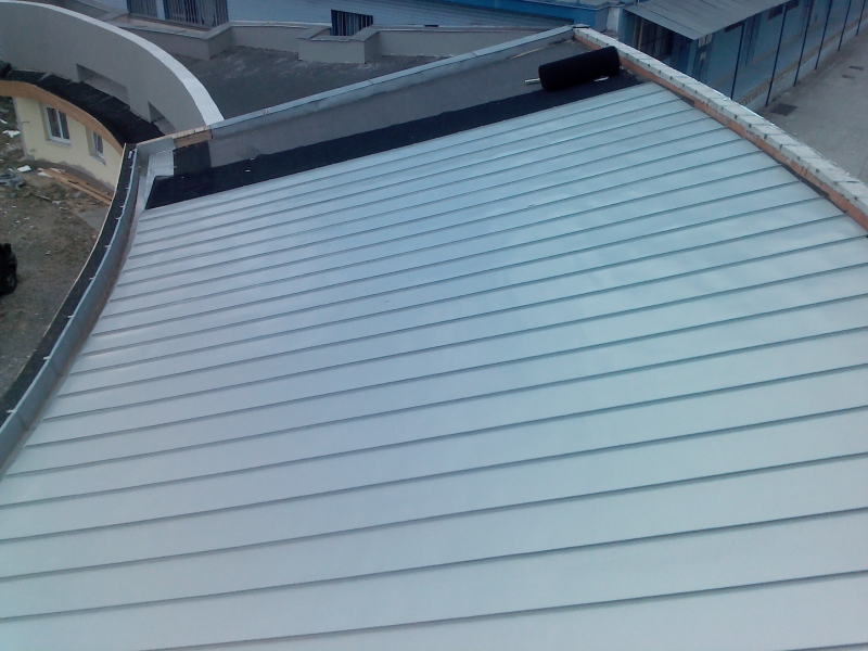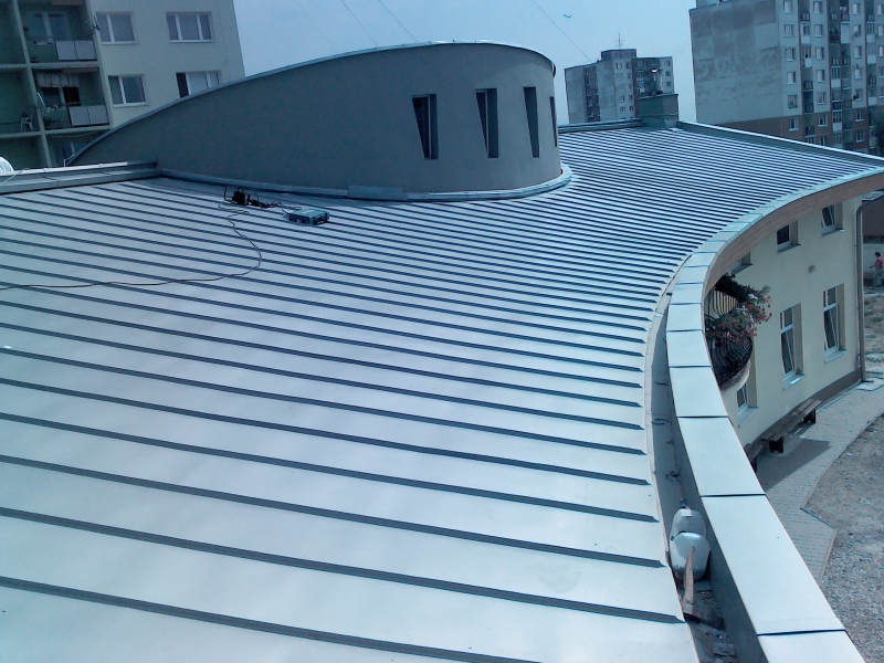 Dodávka a montáž falcované střešní TiZn krytiny Rheinzink, 650m2,krytí na dvojitou stojatou drážku, krytí v poloměru 35m, podkladní separační rohože, výroba a montáž klempířských prvků, tesařské konstrukce nástřešních žlabů, podbednění přesahů střech
