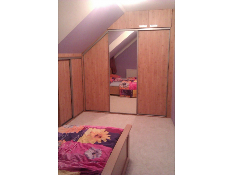 Vestavěné skříně do podkorový se sešikmeným bokem a šikmí my posuvnými dveřmi i s otvíravými dveřmi