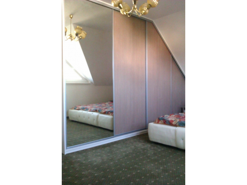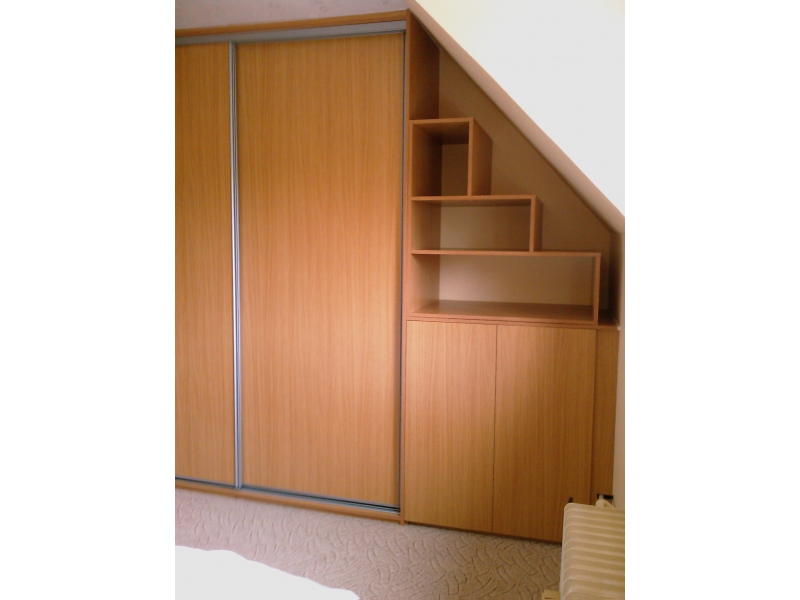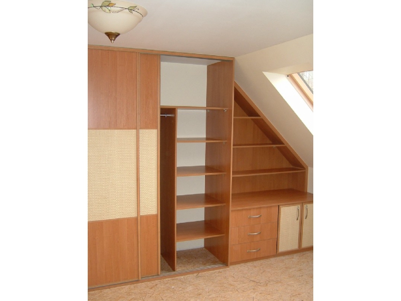 Vestavěné skříně do podkorový se sešikmeným bokem a šikmí my posuvnými dveřmi i s otvíravými dveřmi
