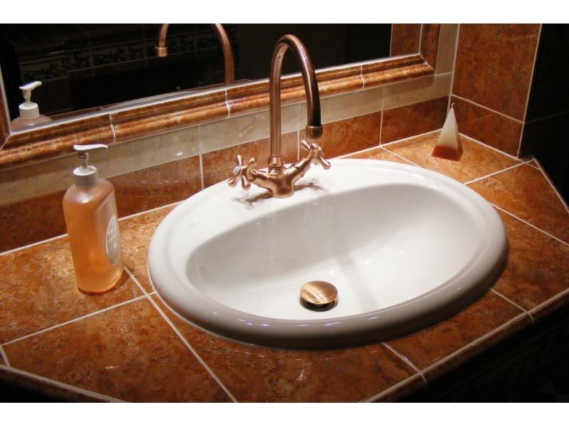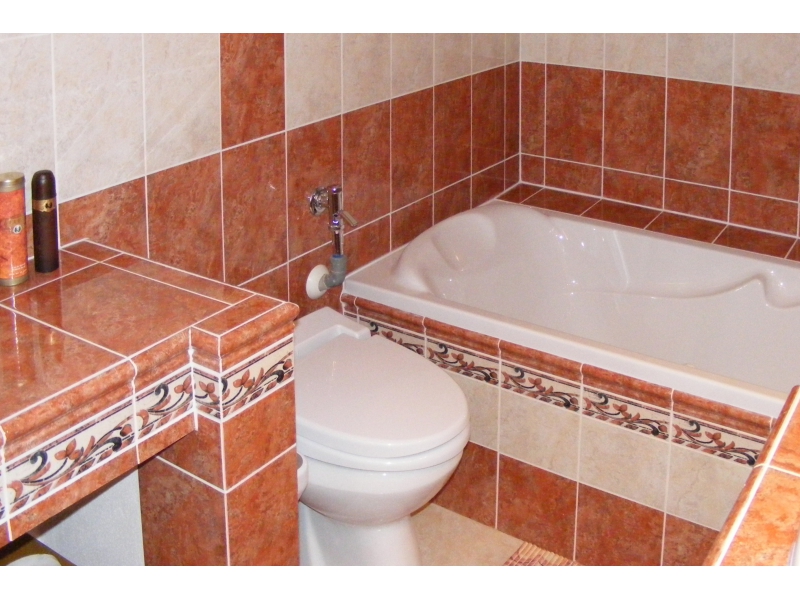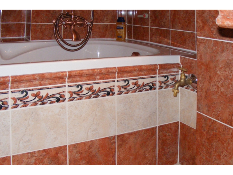 rekonstrukce koupelny Imperial. Zákazník nechtěl žádné plastové lišty a všude požadoval stejné spáry, takže jsem rohové obklady zabrušoval pod úhlem 45°.