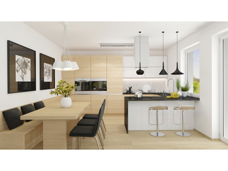 interiér jednopodlažního rodinného domu byl navrhnut v jednotném duchu: světlý a jednoduchý interiér, který působí příjemně na své budoucí obyvatele.