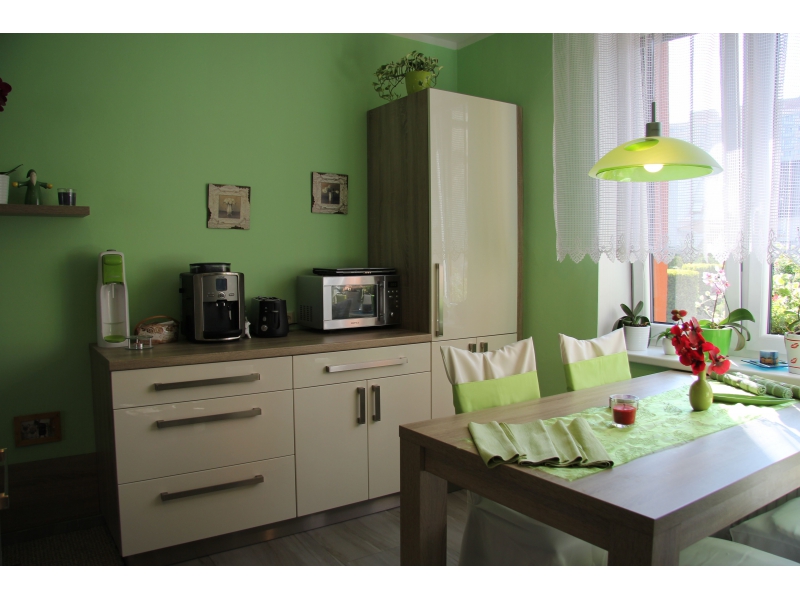 Kuchyňská linka atipických rozměrů,včetně vestavných spotřebičů,stříkaných dvířek do vysokého lesku,obklad stejný jako pracovní deska a kování blum. K nové kuchyňské lince jsme vyrobily i krásnej novej jídelní stůl.