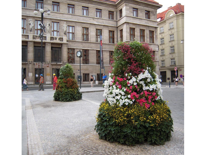 Dodáváme velké květináče, závěsné sestavy pro výzdobu sloupů, zábradlí, fasád, žardiniery pro stromky, konstrukce pro vertikální zahrady a jiný květinový mobiliář, cibuloviny a jejich směsi, rohože Nidagravel, směsi květinových semen pro letničkové louky.