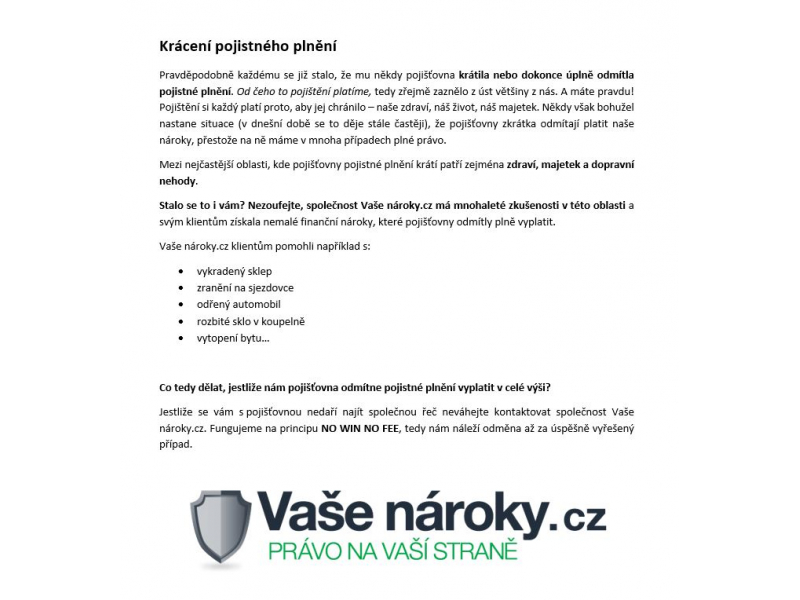 Stačí vyplnit online formulář na našem webu a pomůžeme vám peníze od pojišťovny získat. U nás navíc neplatíte žádné poplatky. Náleží nám pouze odměna z vymožené částky.