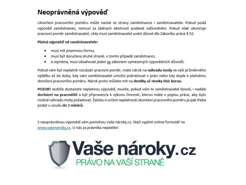 Dostali jste v práci neoprávněnou výpověď? Braňte se! Vaše nároky.cz Vám pomohou. Stačí zadat případ online a posoudíme, na co máte nárok.