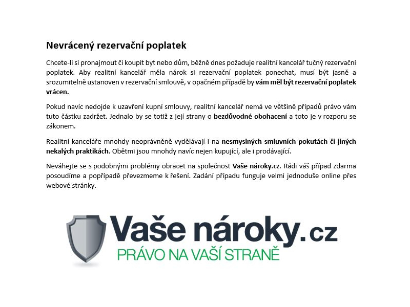 Nevrátila vám realitní kanceláře rezervační poplatek, i když nedošlo ke koupi nemovitosti? Pak pravděpodobně jednala neoprávněně a vy máte nárok na vrácení peněz.