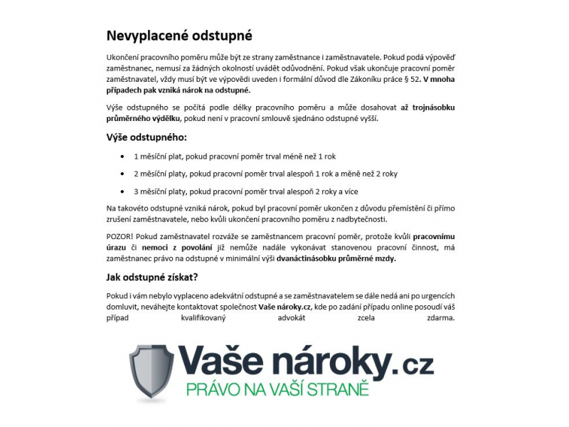 Nezaplatil vám zaměstnavatel po výpovědi odstupné? Pomůžeme vám peníze získat! Stačí zadat případ online na našich webových stránkách a zdarma posoudíme, zda máte na odstupné nárok.