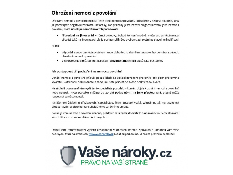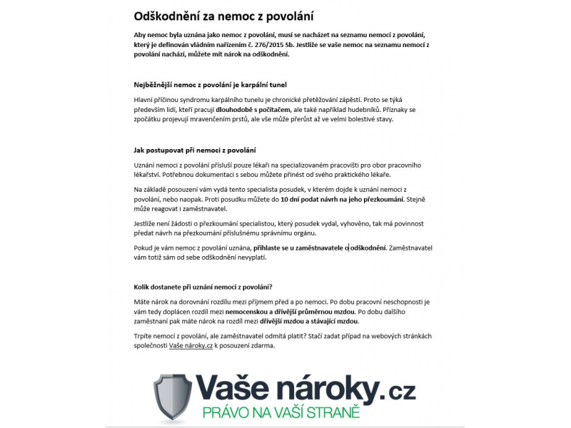 Pomůžeme vám. Společnost Vaše nároky.cz za klienty odškodnění za nemoci z povolání řeší. U nás neplatíte za právníka.