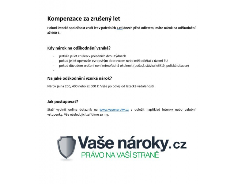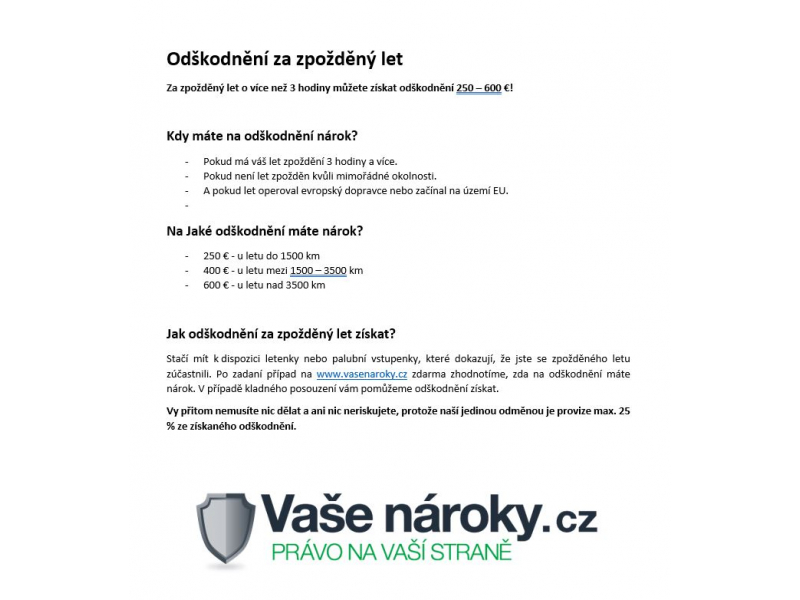 Pomůžeme vám odškodnění od letecké společnosti získat, navíc bez poplatků a rizika. Naší jedinou odměnou je provize max. 25 % ze získané částky.