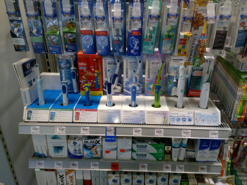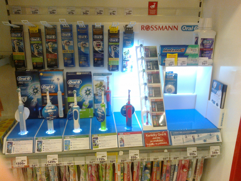 Ukázka výrobku pro podporu prodeje v místě prodeje, konkrétně se jedná o prodejnu drogerie řetězce Rossmann. Centrum je osvětleno LED diodami a kartáčky jsou dobíjeny.