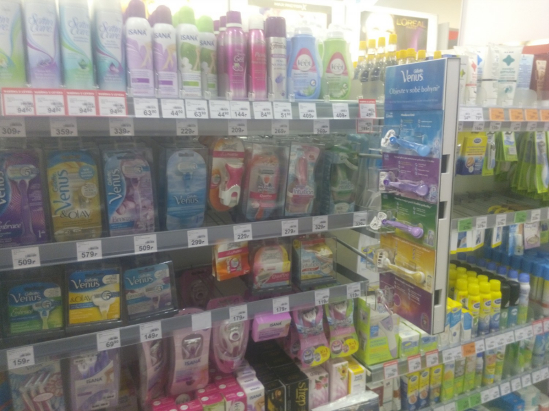 na prodejnách DM drogerie markt jsou umístěné lišty díky kterým si zákazník může prohlédnou i "osahat" holicí strojky