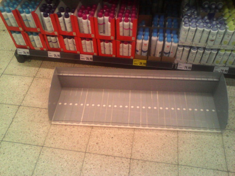 sklopné lůžko sloužící ke srovnání a třídění zboží v regále na prodejně, v tomto případě se jedná o prodejnu Kaufland