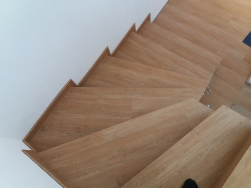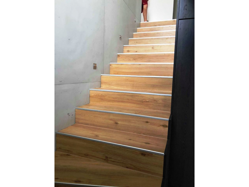 Obklad betonového schodiště pomocí lepeného vinylu Gerflor. Samotnému obkládání předcházelo vyrovnání původního podkladu stěrkou, aby byl povrch dokonale rovný a obklad perfektně seděl !