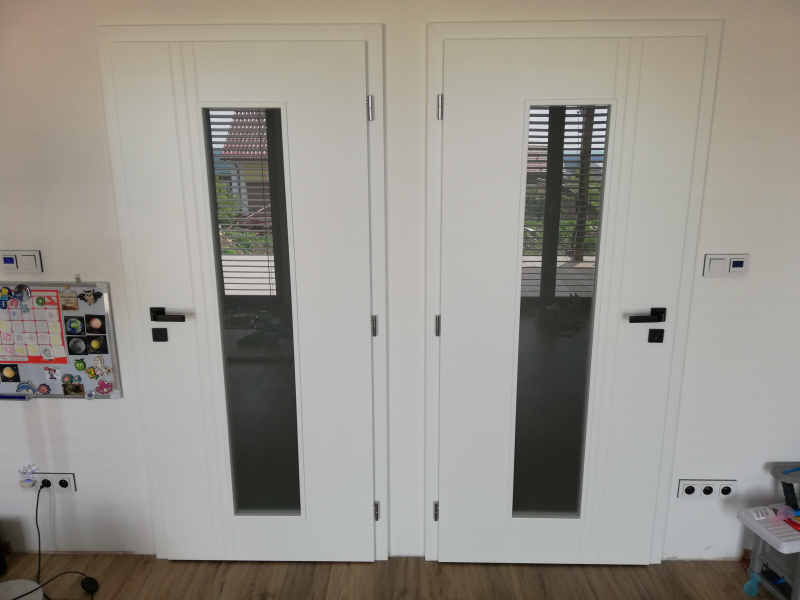 Interiérové dveře - povrchová úprava bílý lak. Kování a mušle k posuvným dveřím v černé barvě.