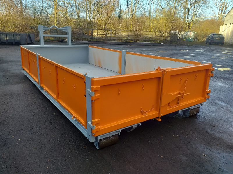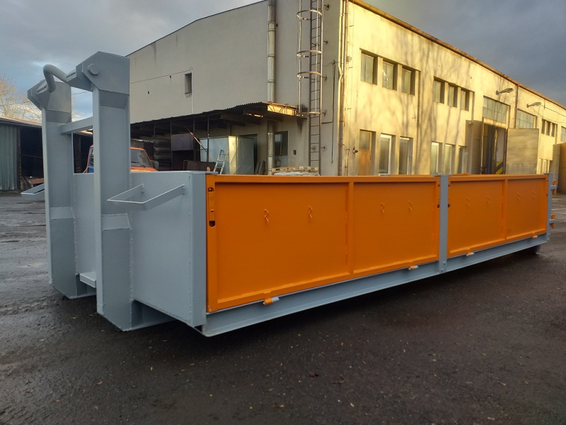 Kontejner typ Abroll, zesílené provedení, 4x sklopné sajtny se zavíráním na Euroclipy, 4x vyndavací sloupek, nájezdy umístěné na předním čele, varná oka v podlaze pro kurtování nákladu, rolny a všechny panty opatřeny maznicemi, certifikační štítek.