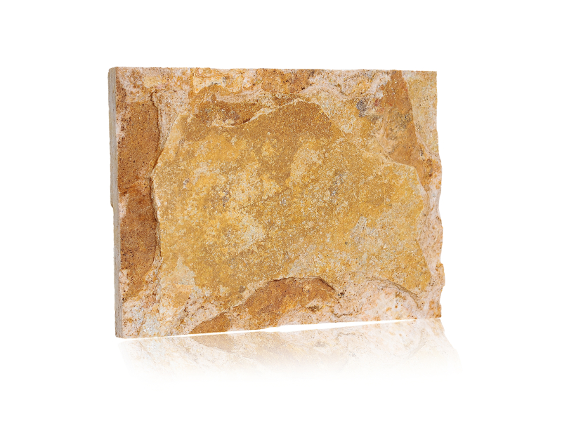 Tvarovaná obkladová deska Glitz z přírodního kamene v žluté barvě zaujme svými unikátními vlastnostmi, např. dlouhou životností, odolností proti oděru a vysokou pevností v tlaku.