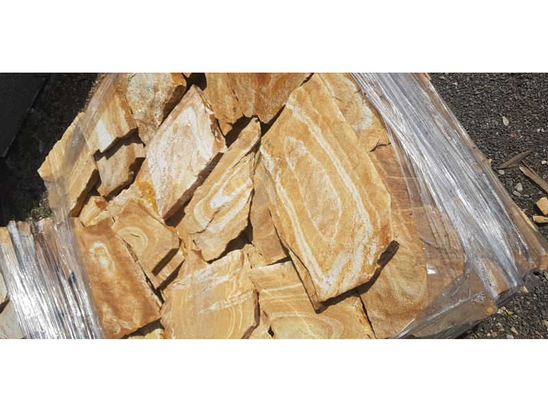 Přírodní kamenná netvarovaná dlažba z Balkánské ruly Gneis - barva žlutá, tloušťka 2-4 cm. Unikátní stylový přírodní kámen je vhodný na dlažbu podlahy do interiéru i exteriéru v domech i větších budovách.
