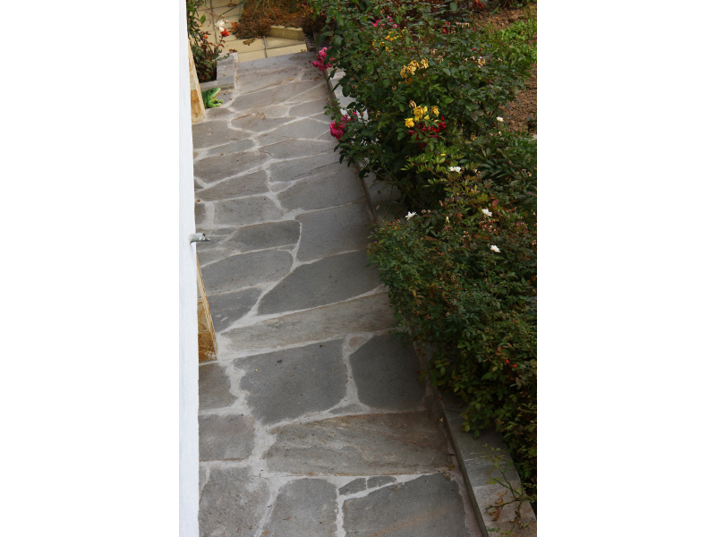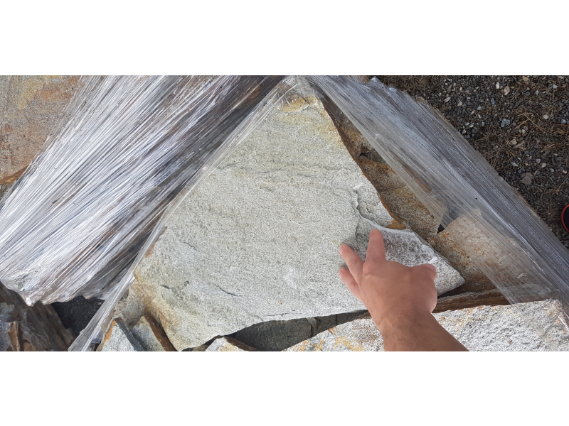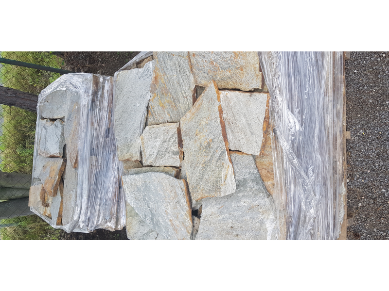 Přírodní kamenná netvarovaná dlažba z Balkánské ruly Gneis - barva šedá metalíza, tloušťka 2 - 4 cm. Unikátní stylový přírodní kámen je vhodný na dlažbu podlahy do interiéru i exteriéru v domech i větších budovách.